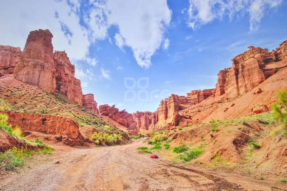 Charyn Canyon, often referred to as the "Grand Canyon’s little brother," is one of Kazakhstan’s most stunning natural landmarks. Located about 200 km east of Almaty, it stretches over 154 kilometers in length and is up to 300 meters deep. The canyon is renowned for its vibrant red rock formations, which have been shaped by millions of years of erosion.