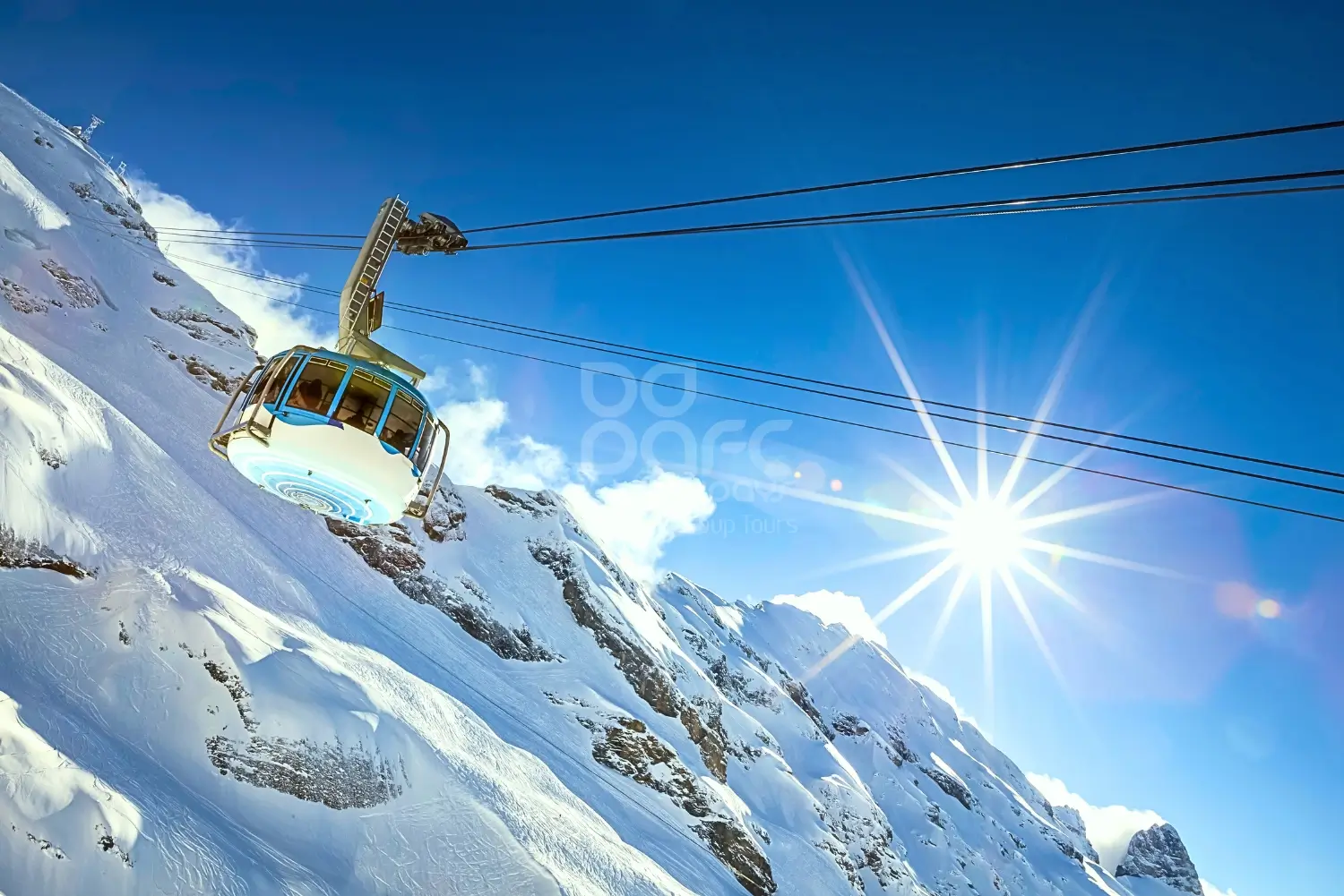 Titlis Rotair revolving cable car: Board the revolving cable car, which provides 360-degree panoramic views of the majestic snow-capped peaks, deep valleys, and ice boulders below.