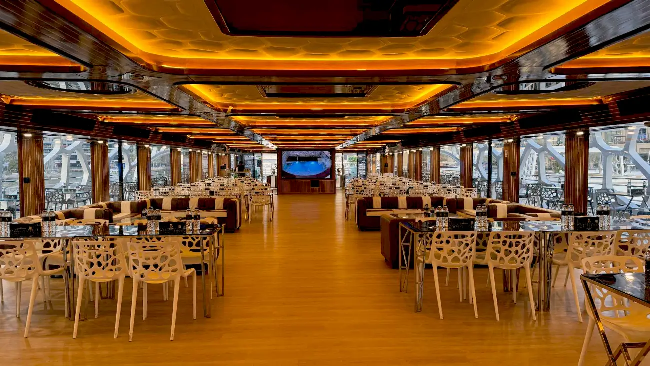 Embark on the Mega Yacht, sailing toward Atlantis Hotel. Marvel at the stunning view of Palm Jumeirah and Blue Water Islands. The breathtaking views take center stage as you cruise through Dubai’s turquoise waters. Enjoy a diverse buffet of international cuisines and a wide selection of soft drinks and alcoholic beverages (depending on the package). The cruise will start and end in Dubai Marina.