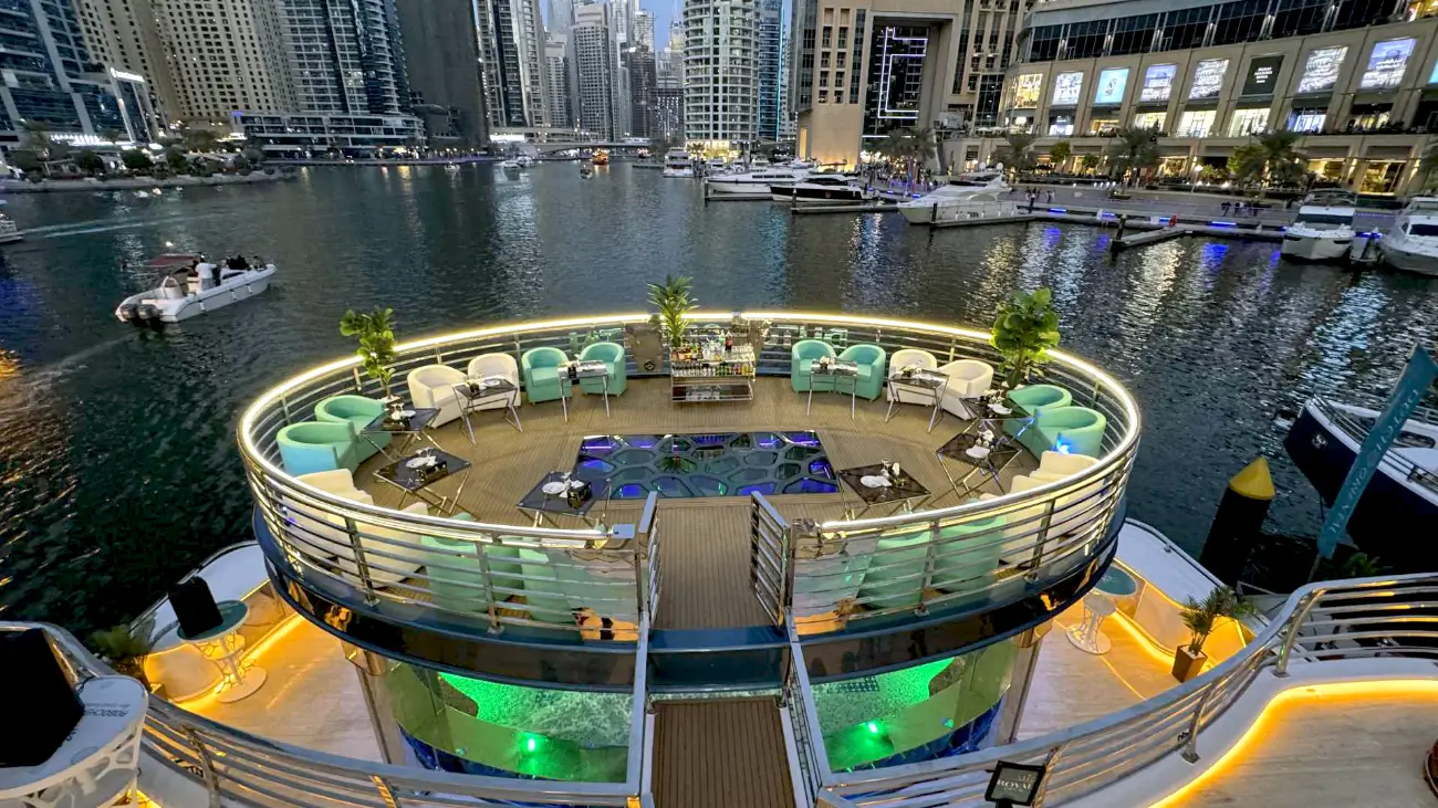 Step aboard the Lotus Royale Megayacht and settle in as it heads toward Atlantis. The route gives you wide views of Palm Jumeirah and Bluewaters Island while the city lights start to reflect off the water. The yacht is built for open-deck sightseeing, so the scenery does most of the work as you move through Dubai Marina and out across the coastline.